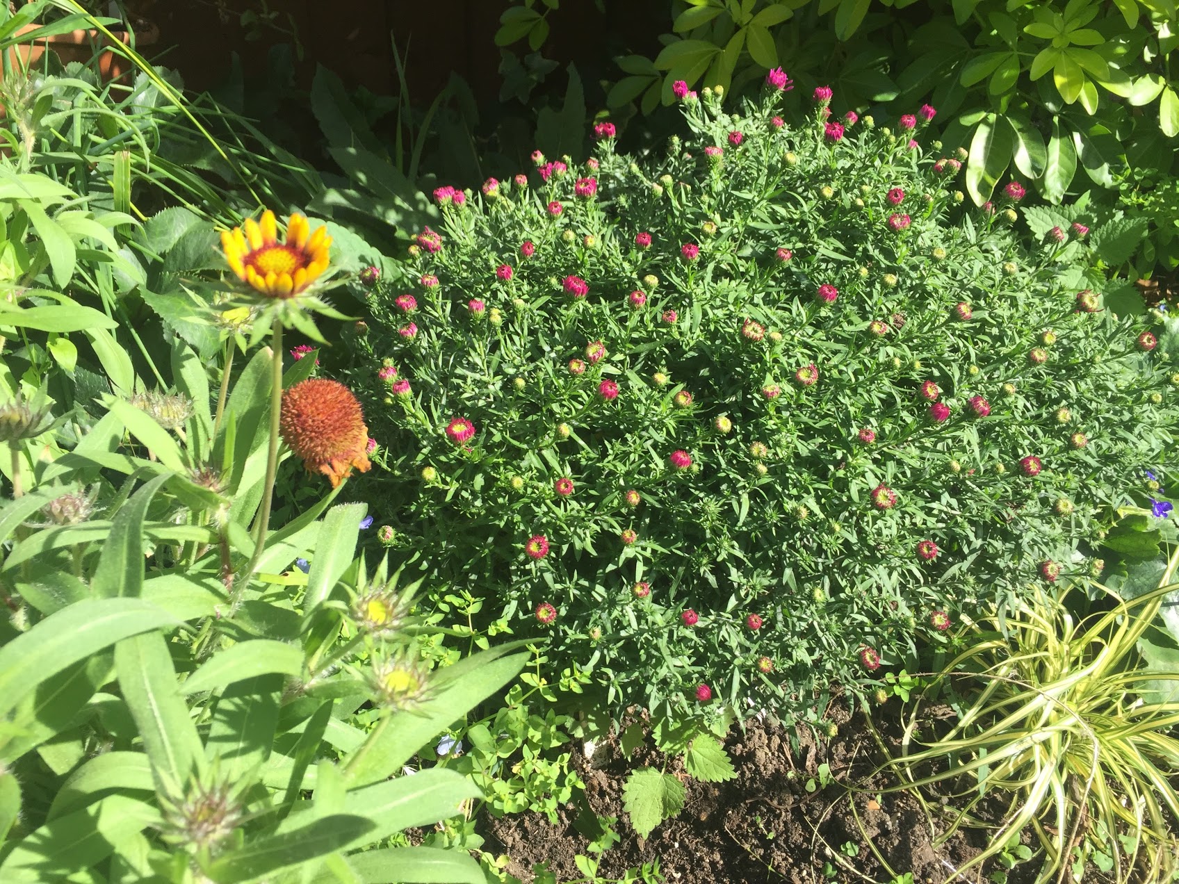 Aster Novi Belgi Jenny, who after three seasons of growth, is only just now, as you can see, on the verge of bursting forth with an abundance of semi-double, purple-pink flowers.
