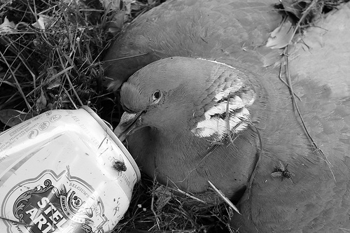 Do you find the image of a dead bird drinking from a half-crushed can of Stella amusing?