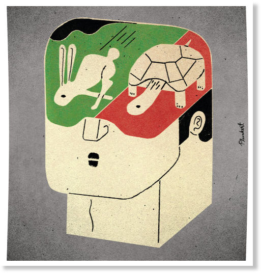 As you may have gathered by now from the various books and articles that followed the publication of Daniel Kahneman’s Thinking, Fast and Slow, we live our lives predominantly through two neural networks. One, an emotionally hot, Go! system which does well in situations requiring quick reactions to emotion-arousing stimuli that have the potential to trigger pleasure, pain, or fear. It’s this system that largely kept our savannah-dwelling ancestors alive for millions of years in the midst of hungry predators much stronger and faster than them.